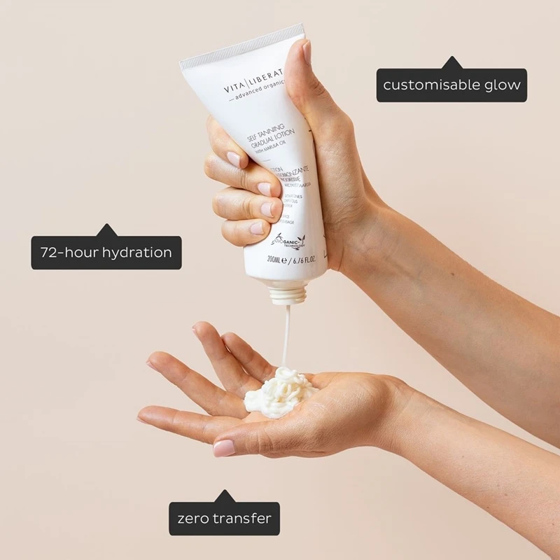 Avant d’appliquer la crème autobronzante, assurez-vous que votre peau est bien sèche, débarrassée de squames et hydratée (sans que vous ayez eu besoin d’utiliser de produits hydratants juste avant). Mettez le gant d’application et appliquez ensuite la crème bronzante Vita Liberata en exerçant des mouvements circulaires réguliers sur l’ensemble du corps. Rincez après 4 à 8 heures.